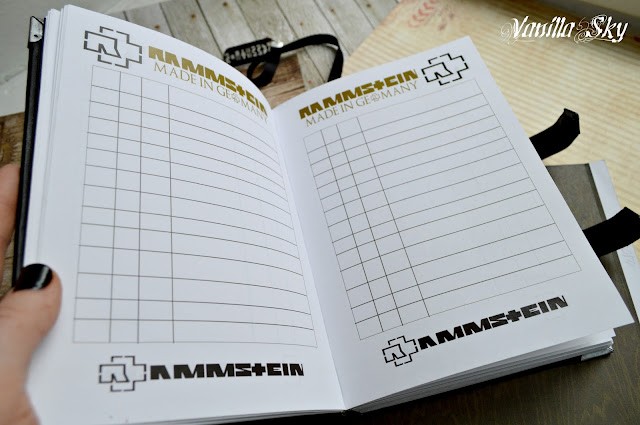 Дизайн страничек разработал сам получатель, все остальное создало мое "больное воображение"))) Хозяин блокнота является фанатом группы "Рамштайн" отсюда пришлось отталкиваться. Для меня рок-группы ассоциируются, естественно, с металлом и черным цветом, поэтому цветовая гамма блокнота получилась черно-металлическая, дополненная шипами и цепями и, конечно же, логотипом самой группы.